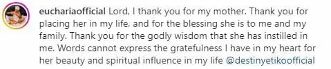 “Lord, I thank you for my mother. Thank you for placing her in my life, and for the blessing she is to me and my family. Thank you for the godly wisdom that she has instilled in me. Words cannot express the gratefulness I have in my heart for her beauty and spiritual influence in my life @destinyetikoofficial”