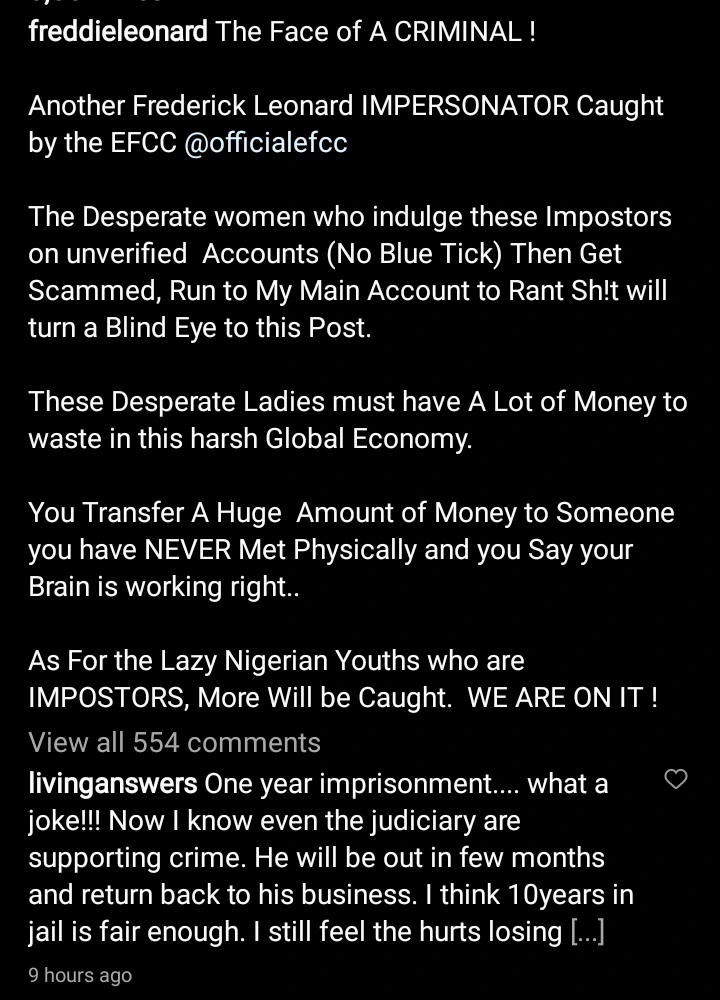“This is the face of the criminal, another Frederick Leonard Impersonator caught by the EFCC. The desperate women who indulge these imposters on unverified accounts then get scammed, run to my main account to rant will turn a blind eye to this post”.